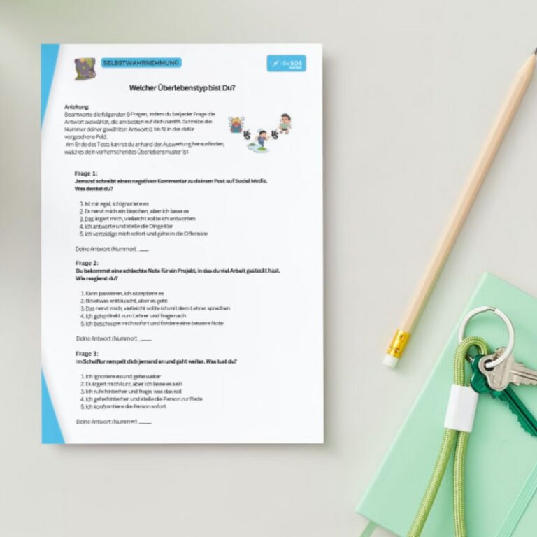 Um Sie dabei zu unterstützen, haben wir einen kleinen Test entwickelt. Dieser ist zwar nicht wissenschaftlich validiert, bietet jedoch eine erste Grundlage, um Ihr Verhalten im Überlebensmodus zu erkennen und zu analysieren. Der Test ist bewusst einfach gehalten und umfasst eine überschaubare Anzahl von Fragen, wodurch er in etwas abgewandelter Form auch wunderbar für Jugendliche geeignet ist.