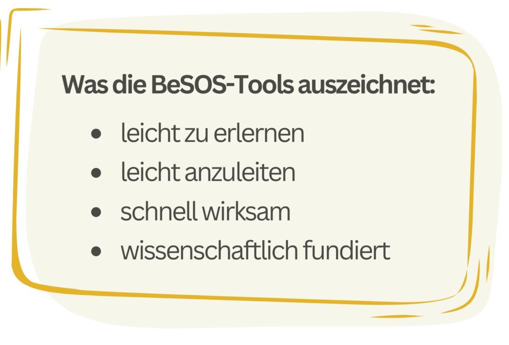Gerade wenn Sie Kinder und Jugendliche begleiten, die aus vielfältigen Gründen einen schweren „Rucksack” tragen müssen, können die BeSOS-Tools dazu beitragen, dass die Zeit in der Schule und Beratung als so sicher erlebt wird, dass sie nicht in den „Überlebensmodus” fallen. Das schafft für diese Kinder und Jugendlichen eine deutlich verbesserte Lebenssituation und gibt ihnen eine bessere Startposition für ihre künftige berufliche und familiäre Entwicklung.